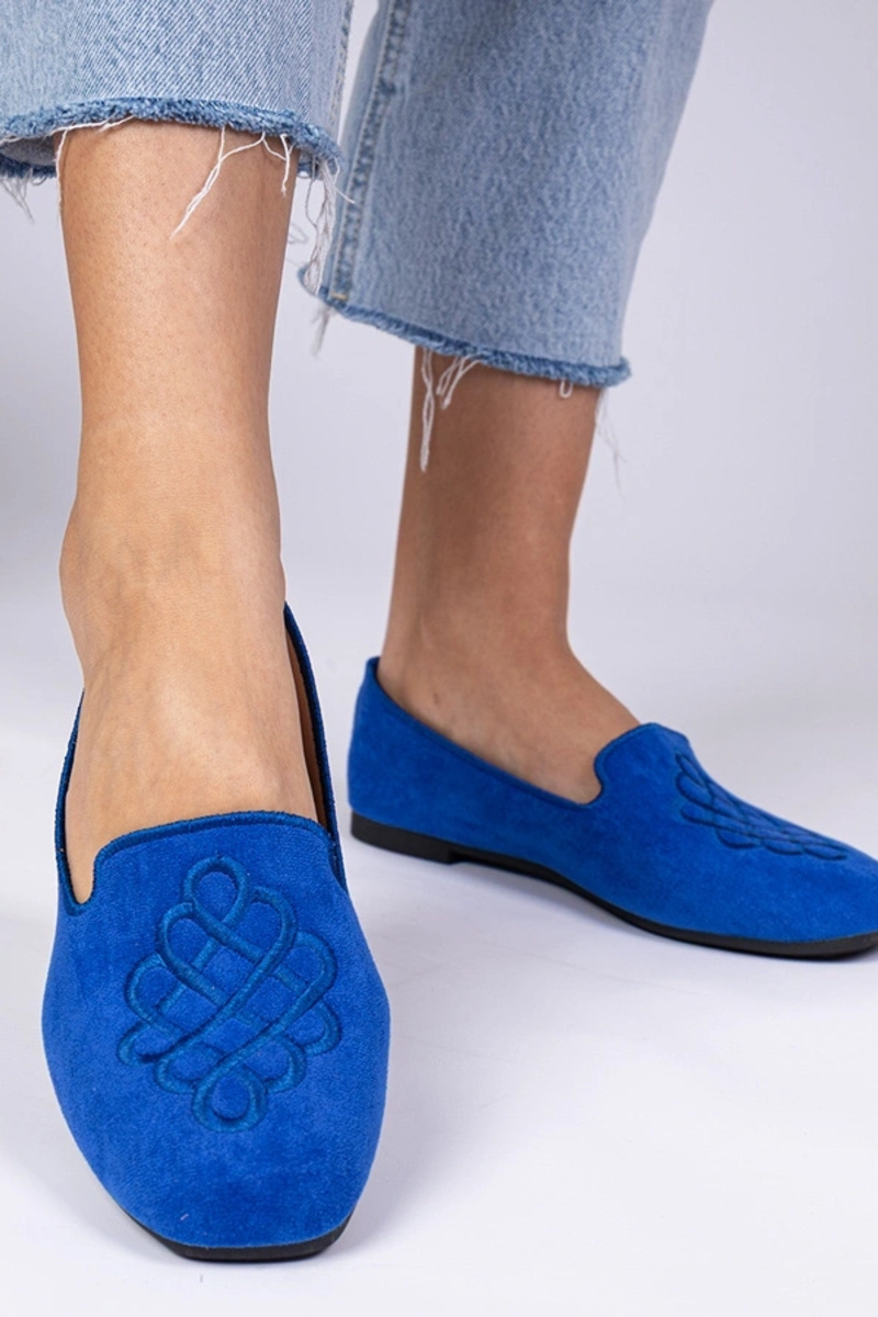 Modré dámske balleríny z umelej semišovej kože s výšivkou