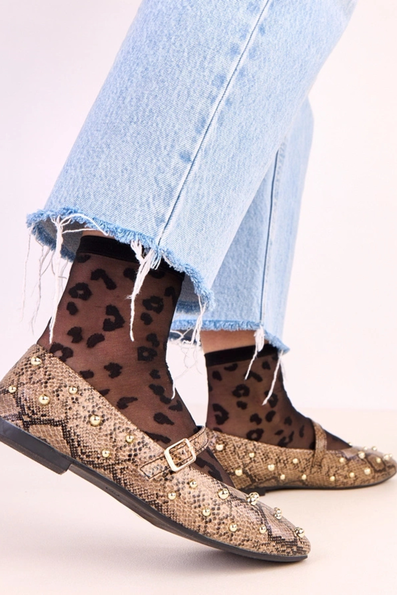 Hnedé Selena baleríny s motívom hadej kože, dekorované perličkami