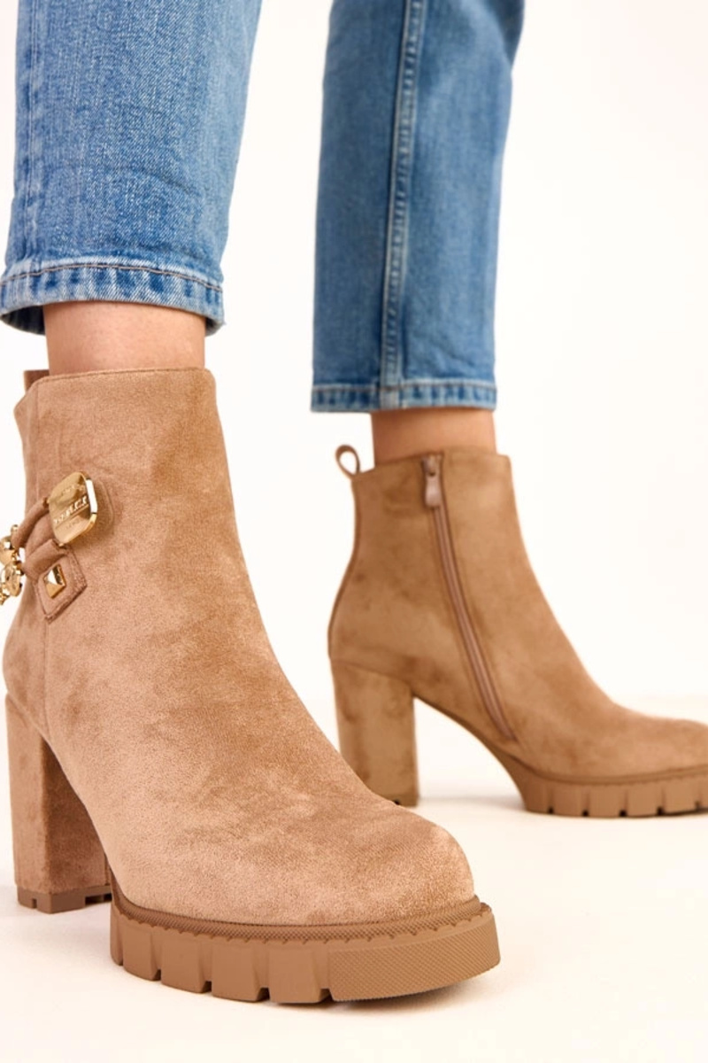 Hnedé čižmy na podpätku s dekoráciou zlatého medvedíka Naste