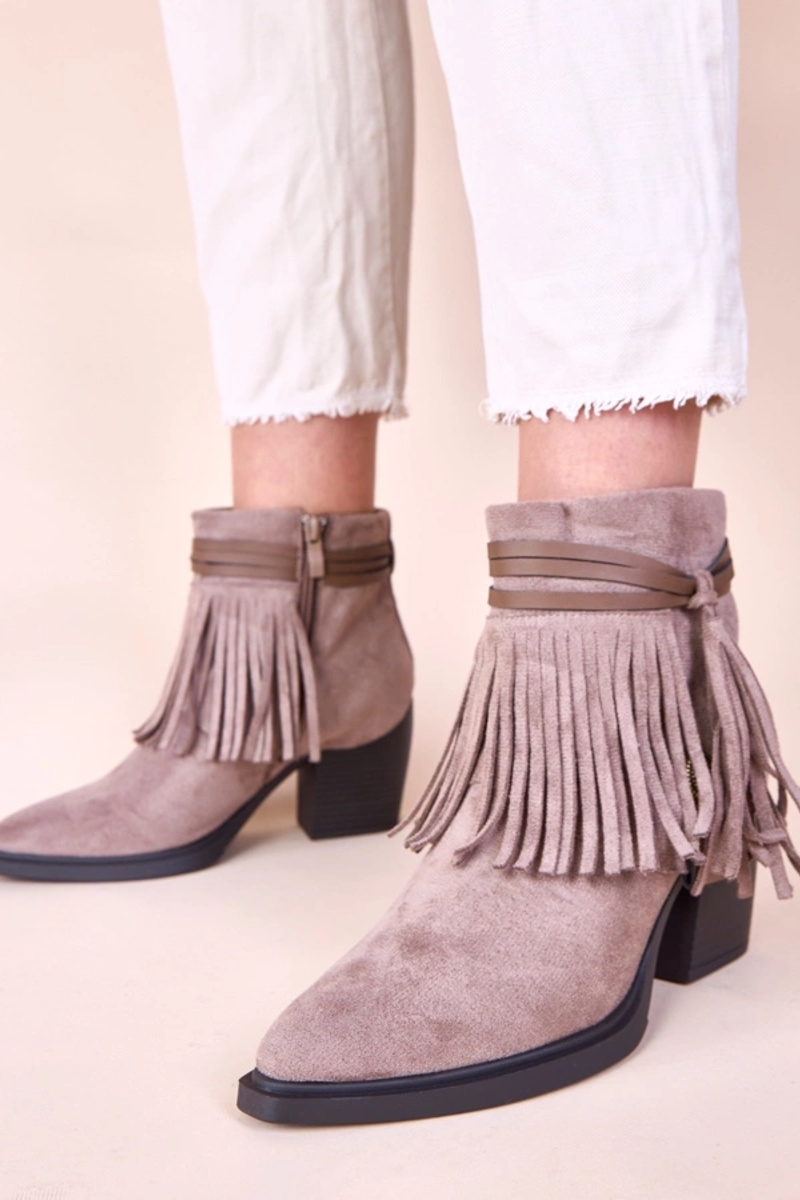 Tmavé pieskové čižmy na podpätku s strapcami Mulan