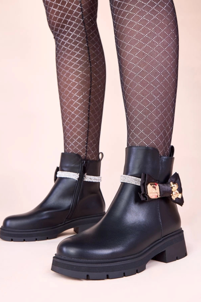Čierne čižmy ozdobené zirkónmi a mašličkou so zlatým medvedíkom Avala