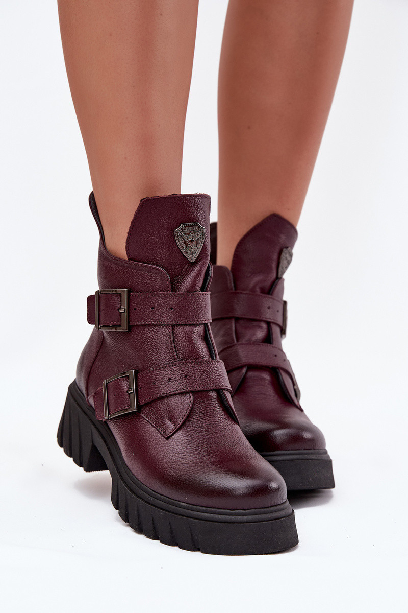 Kožené teplé dámske čižmy so sponkami a dekoratívnymi detailmi Zazoo 60482 bordovej farby