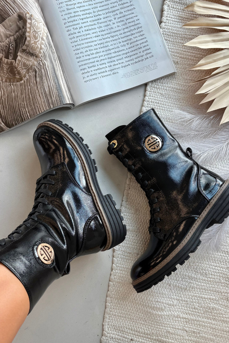 lakované pracovné dámske členkové topánky s detailmi zlaté farby zateplené čiernej farby Dorialine