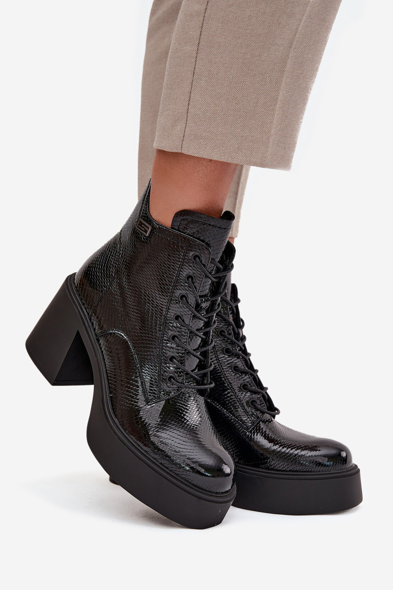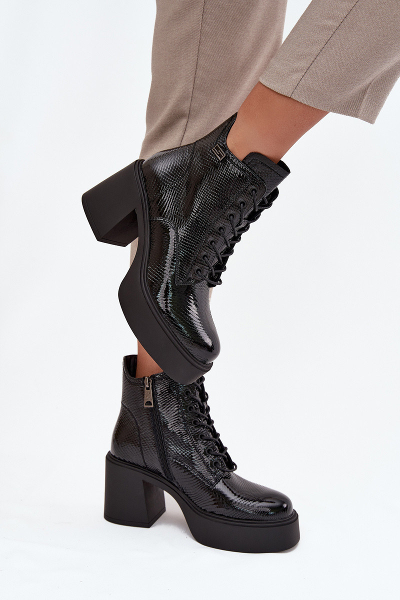 Kožené dámske čižmy s platformou Vinceza 66817 s lakovým efektom čiernej farby