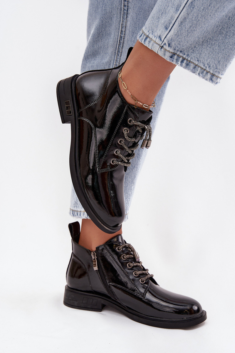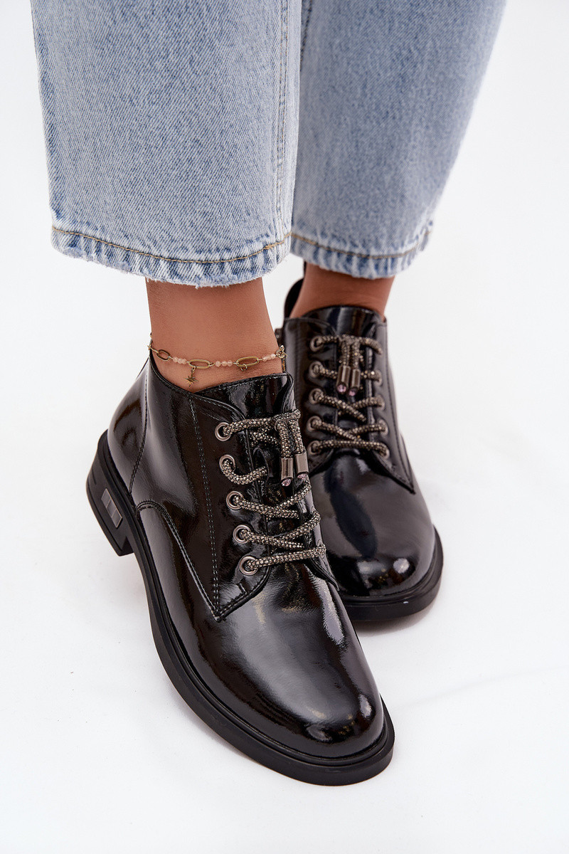 Umelé kožené dámske čižmičky s lakovým efektom s ozdobnými šnúrkami D&A MR52-124 čiernej farby