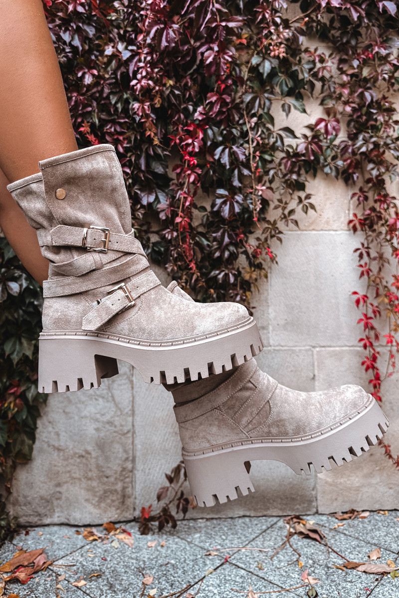 Dámske kotníkové topánky na masívnych podpätkoch so sponami a pásikmi pieskovej farby Nerelisa
