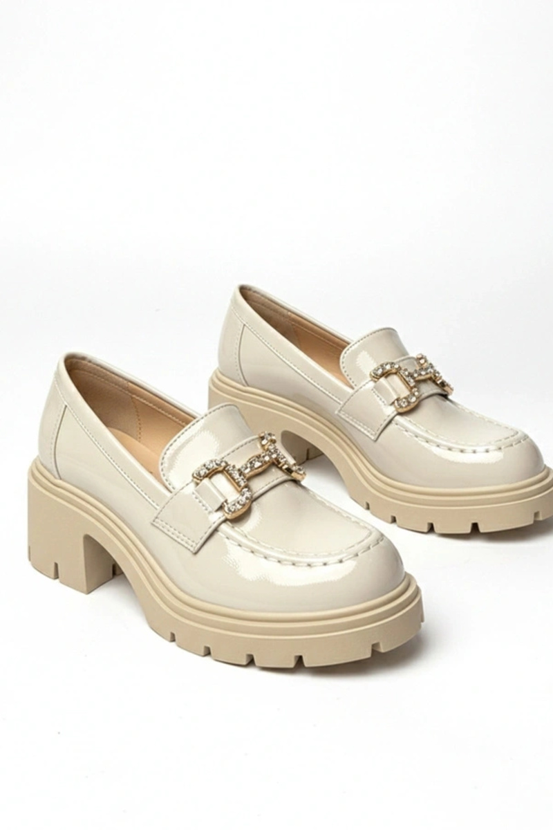 Krémové lakované mokasíny s podpätkom a zirkónmi Paola