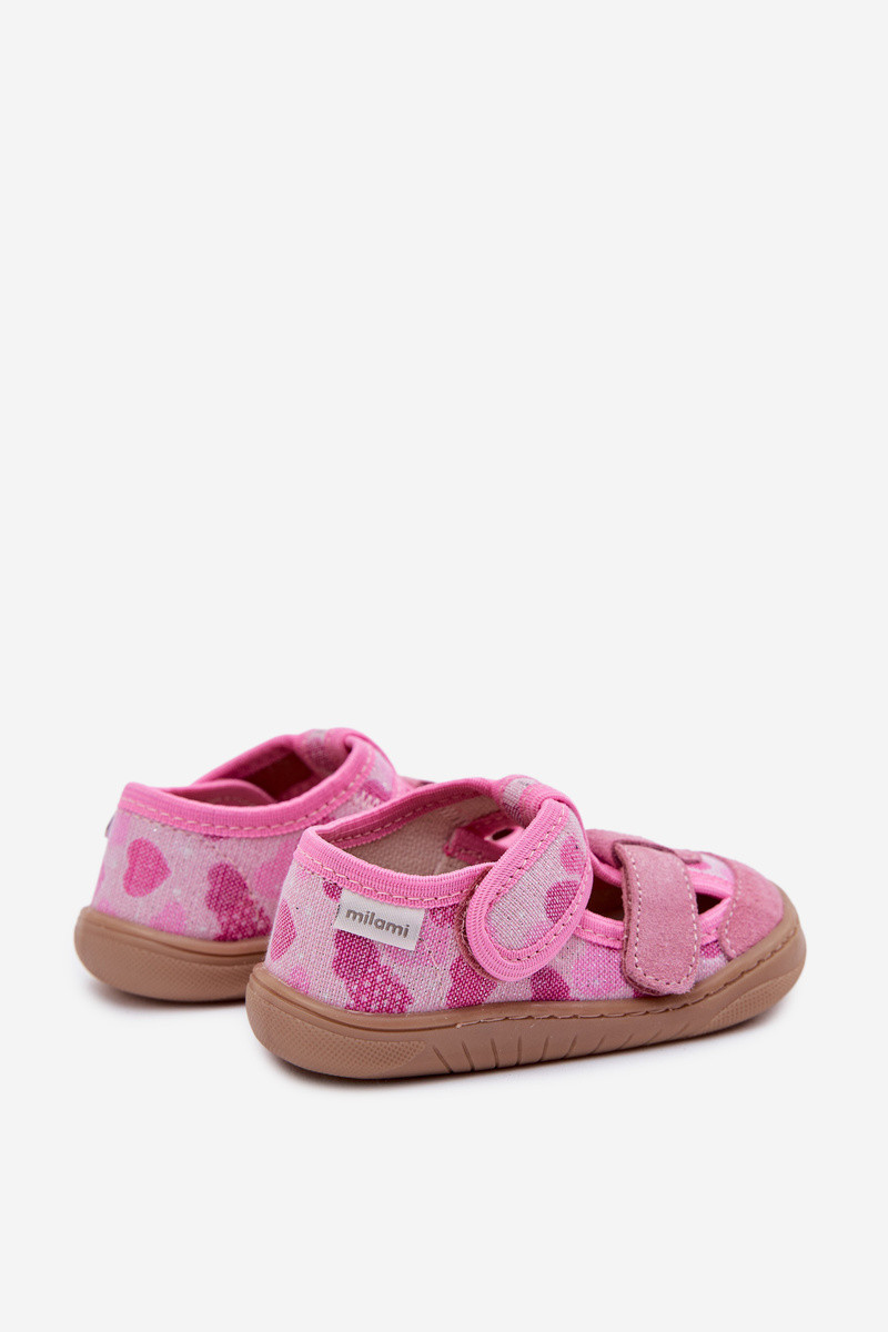 Detské šľapky Milami s leskom a srdiečkami ružovej farby Lumi
