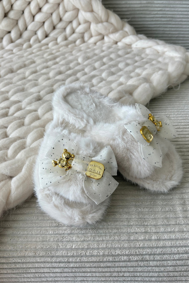Slonovinové dámske papuče s kožušinou, mašľami a zlatou dekoráciou „Nolara"