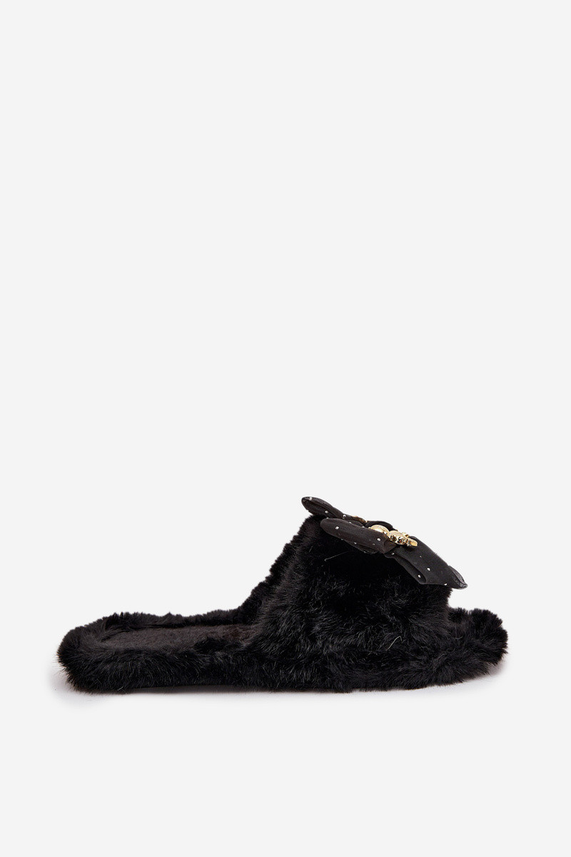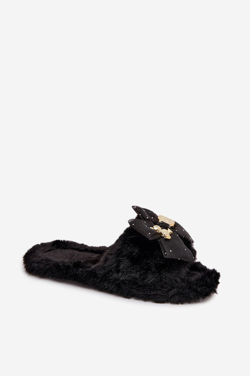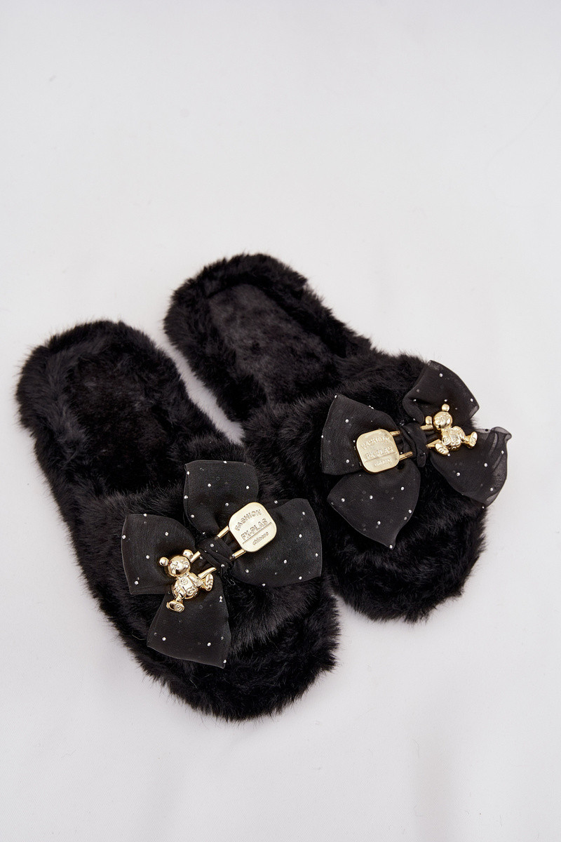 Čierne dámske papuče s kožušinou, mašľami a zlatou dekoráciou „Nolara"