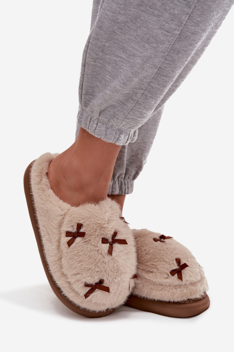 Dámske papuče s kožušinou a mašličkami pieskovej farby Saviera