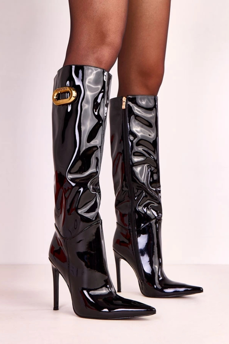Čierne lakované vysoké čižmy so zlatou dekoráciou Herrera
