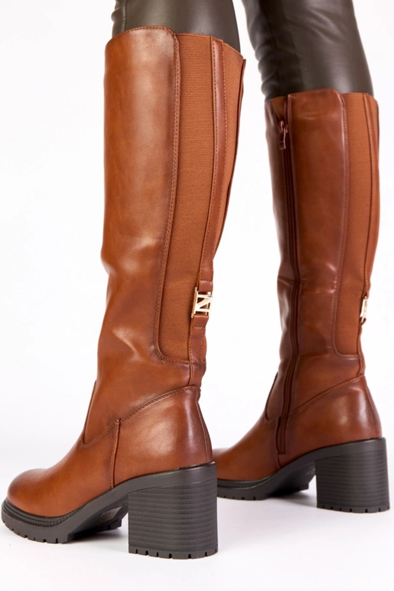 Hnedé vintage štýlové dlhé čižmy na podpätku Akija