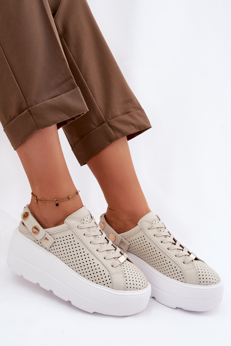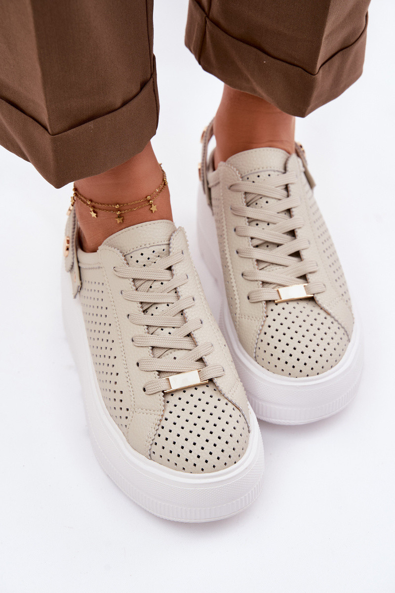 Kožené s prvkami prelamovania Tenisky model obuvi Dámske s platformou s popruhmi Zapnuté Pięcie D&A LR61-7088 béžová