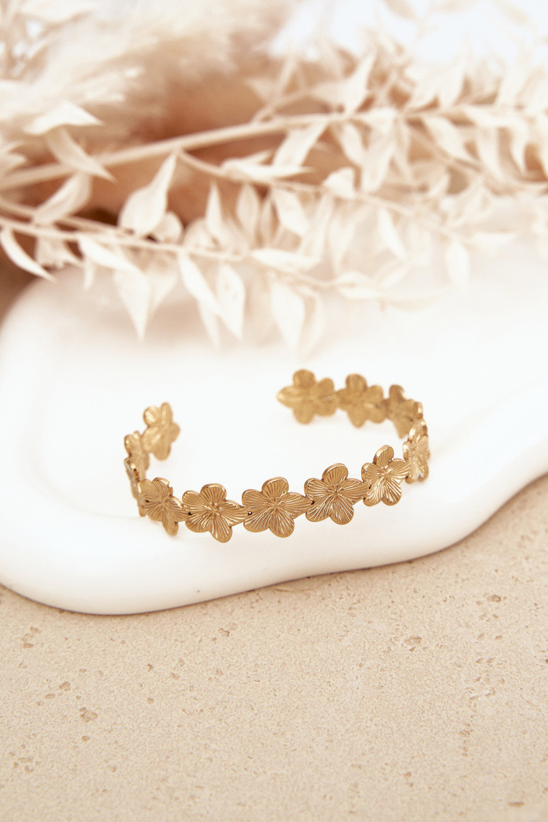 Dámsky náramok z nehrdzavejúcej ocele s kvetinovými motívmi zlatej farby