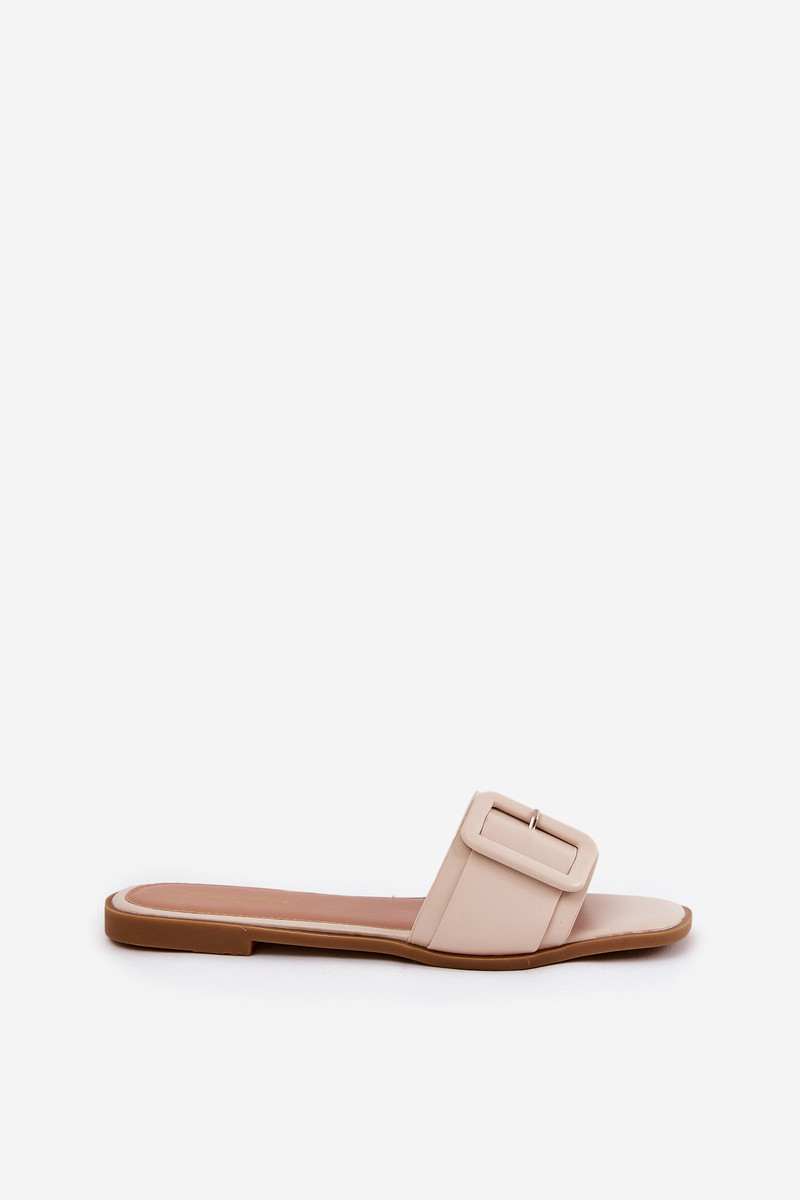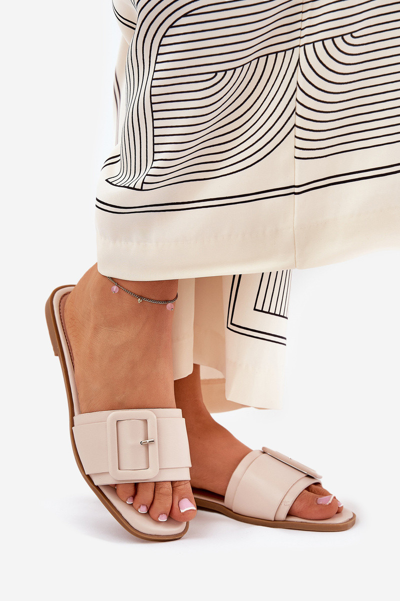 Ploché dámske papuče z umelej kože s sponami pieskovej farby Bamma
