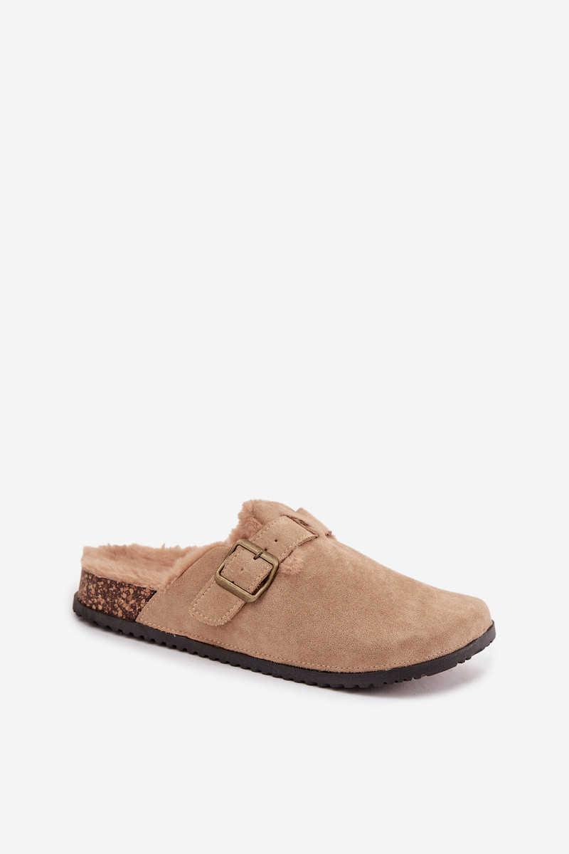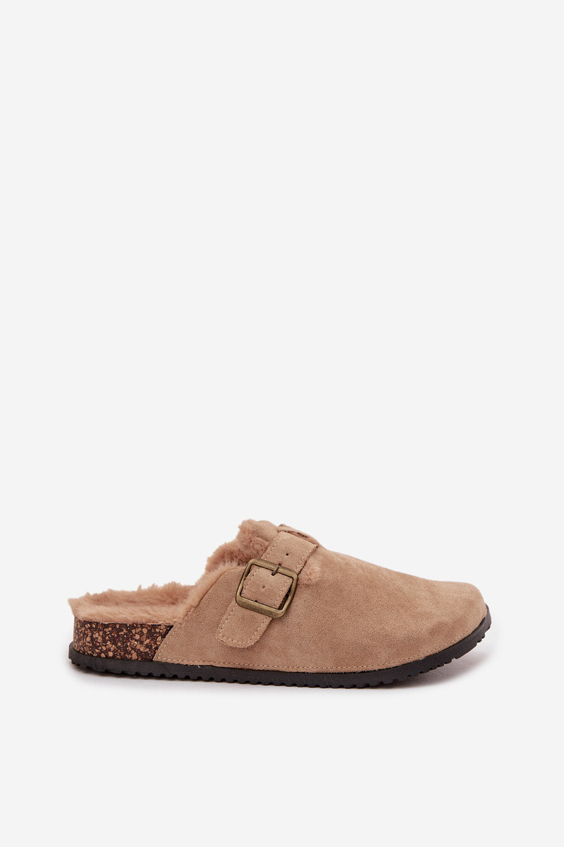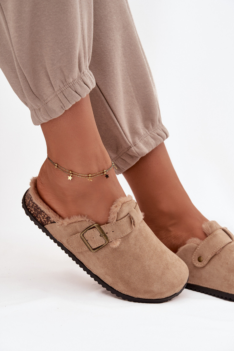 Dámske papuče-klumpa, zateplené s kožušinou vo vnútri a sponami, pieskovej farby Sylisse