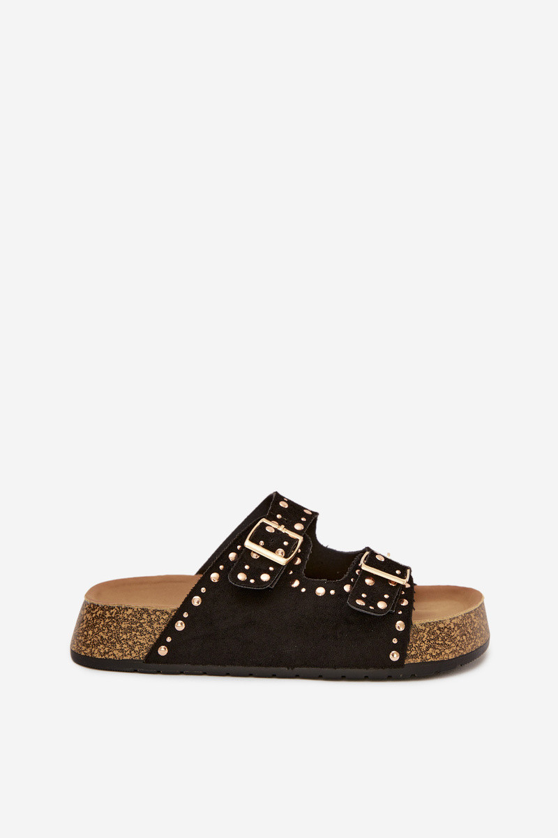 Módne čierne šľapky so zlatými sponami a hrotmi Tervina