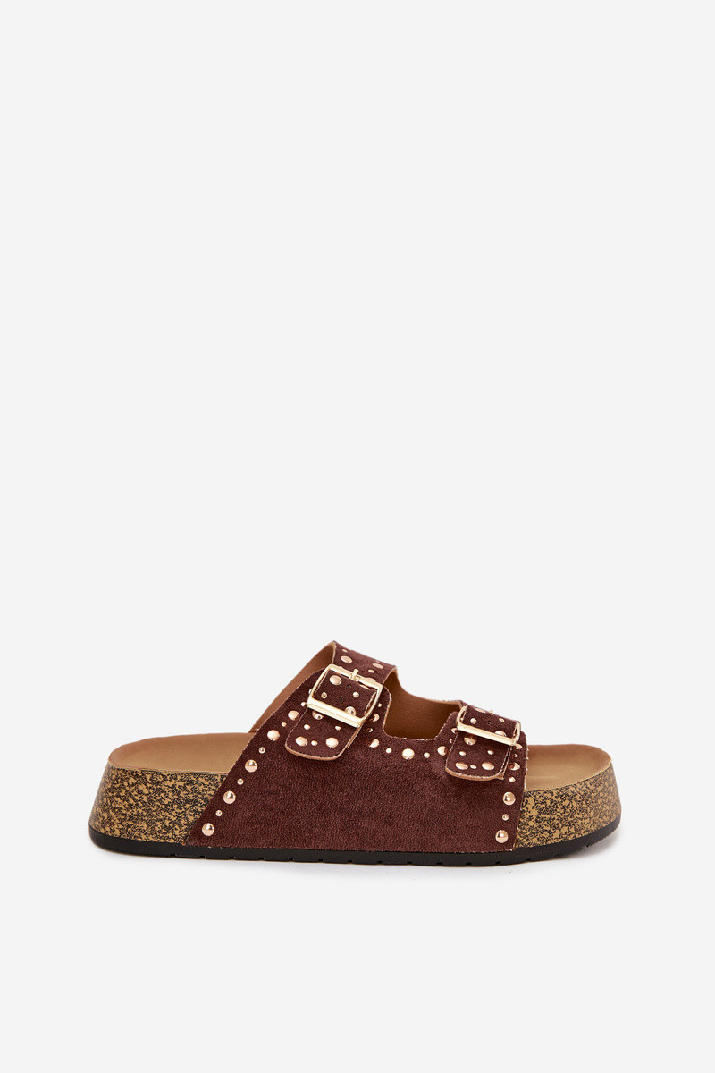 Módne hnedé šľapky so zlatými sponami a hrotmi Tervina