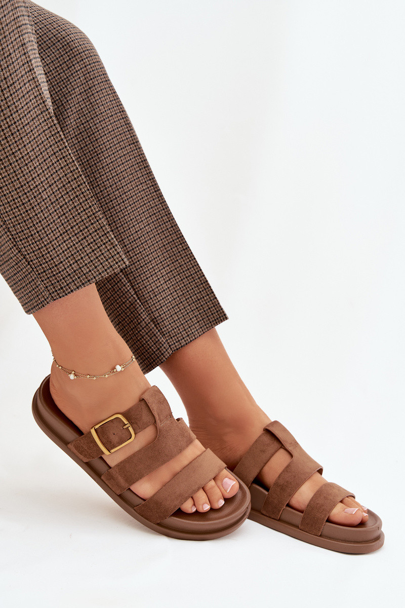 Dámske šľapky s pásikmi zlaté so sponami hnedých farieb Ulirissa
