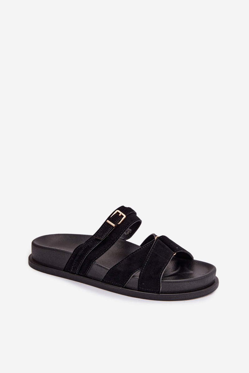 Dámske papuče so zlatými pásikmi a sponami čiernej farby Selorina