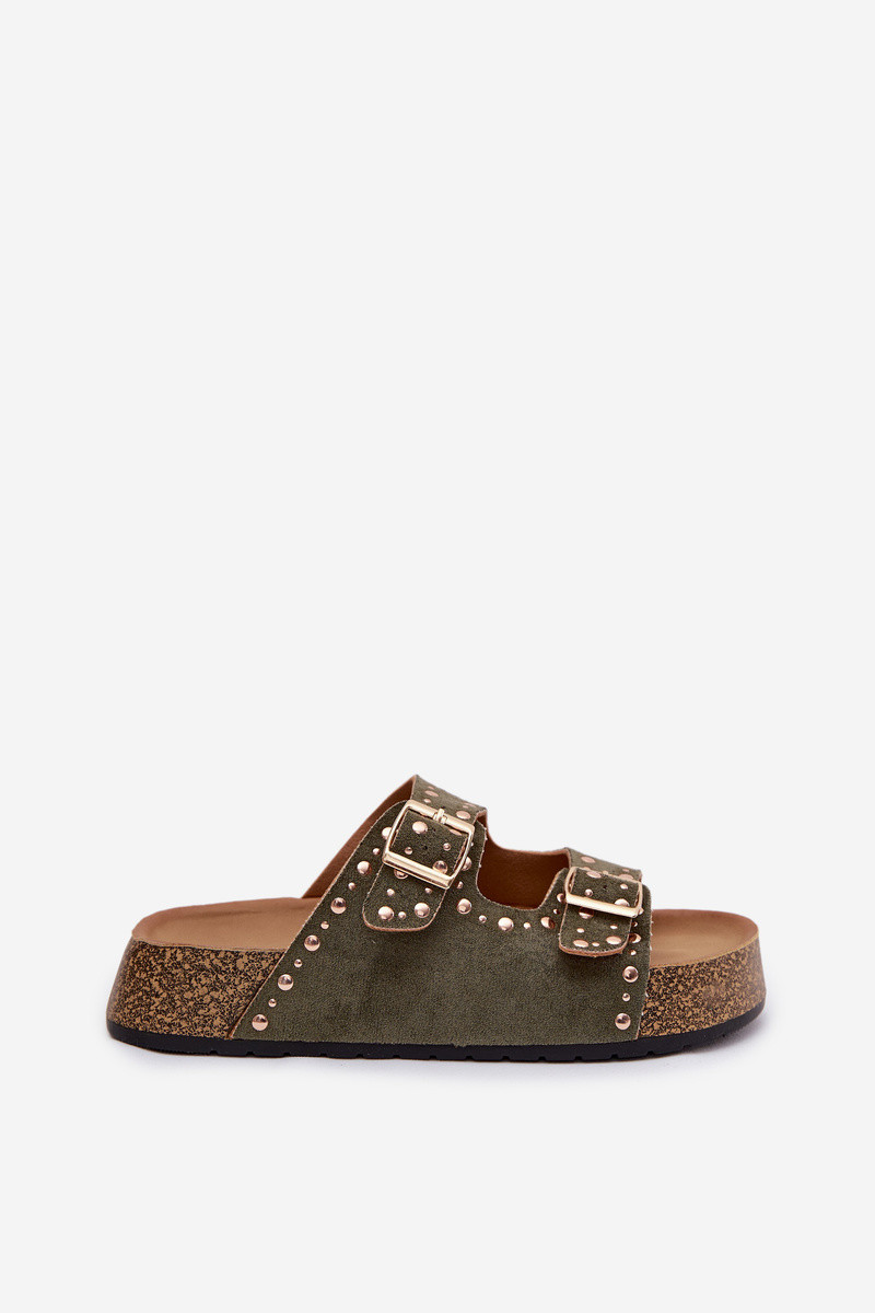 Dámske šľapky zlaté so sponami a hrotmi khaki Tervina