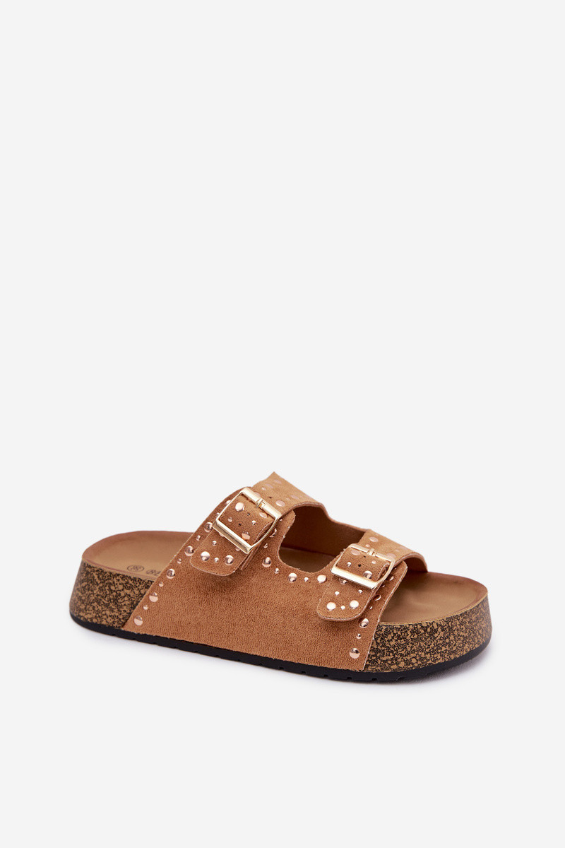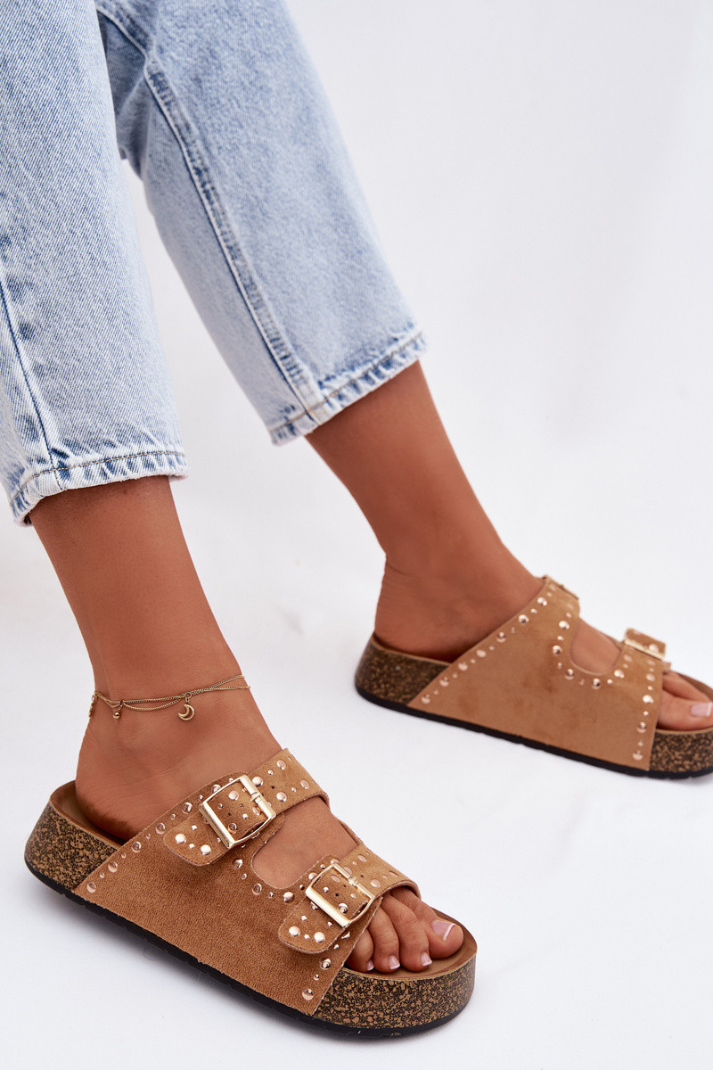Dámske šľapky zlaté so sponami a hrotmi hnedej Tervina