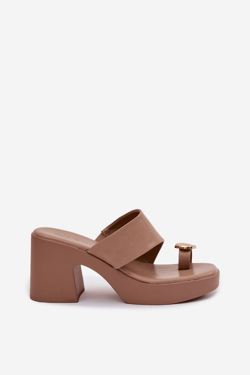 Dámske šľapky s podpätkom v tvare stĺpa a zlatými detailmi pieskovej farby Sinora
