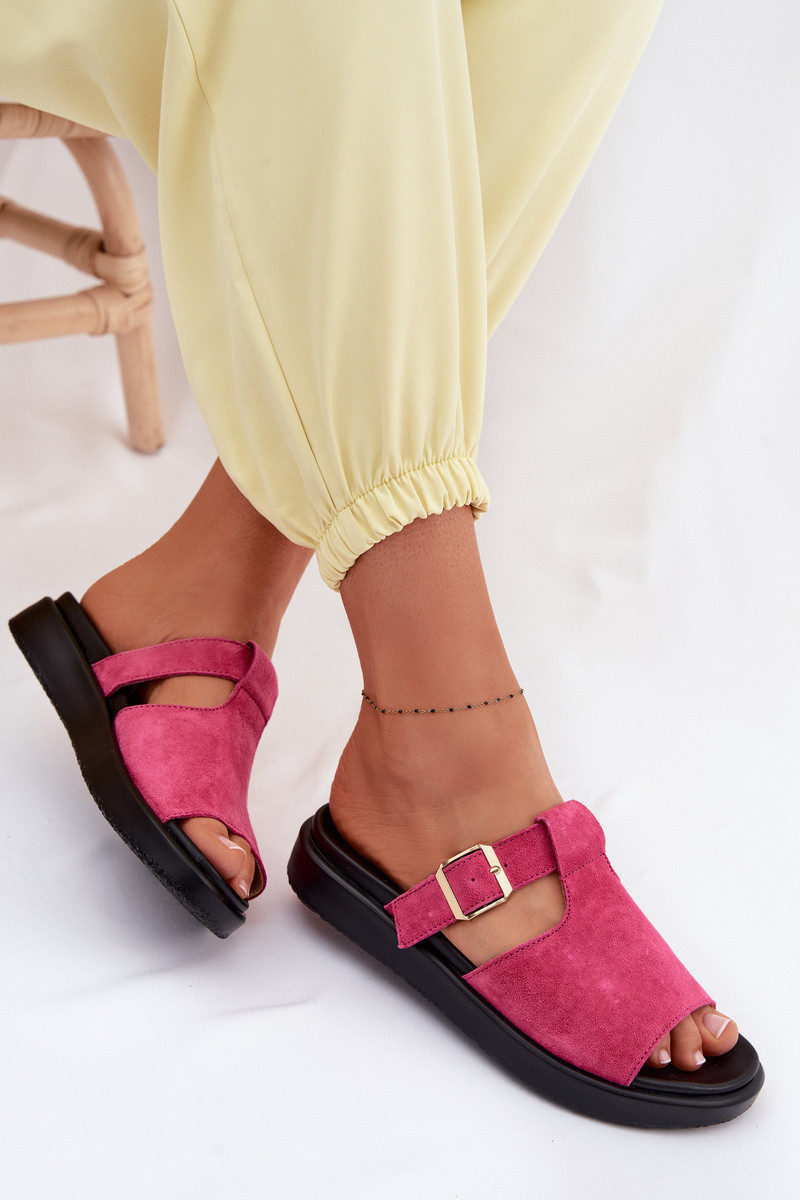 Dámske semišové papuče s platformou so zlatými prackami Ružová Zemela