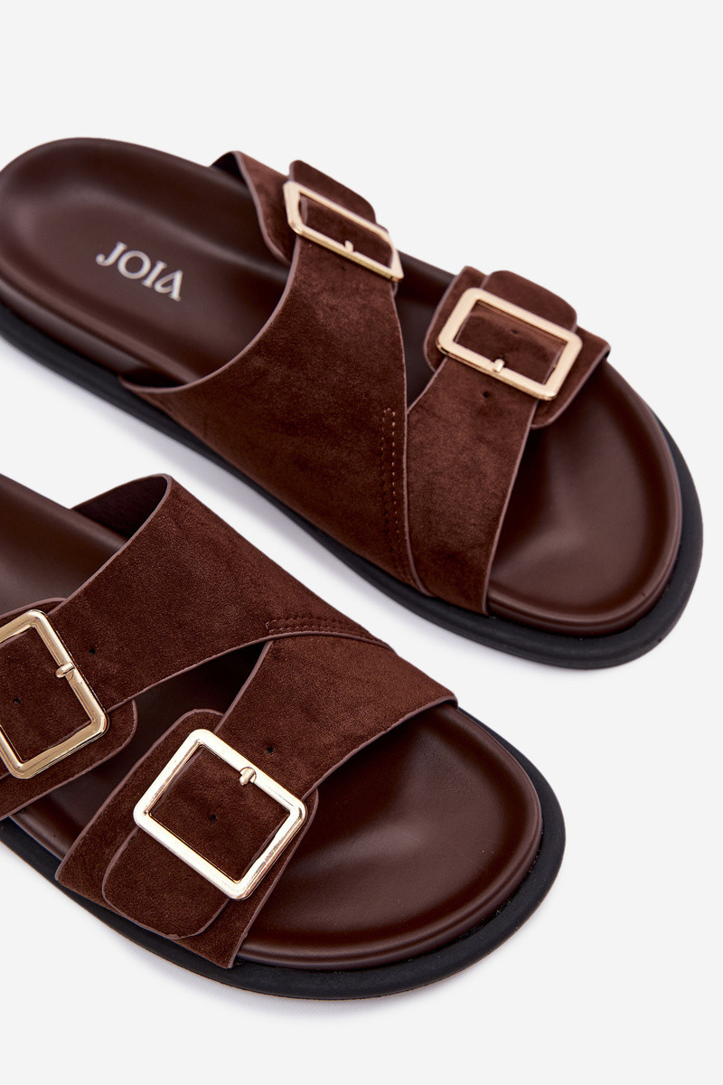 Dámske hnedé šľapky z umelej semišovej kože so zlatými sponami Selissea