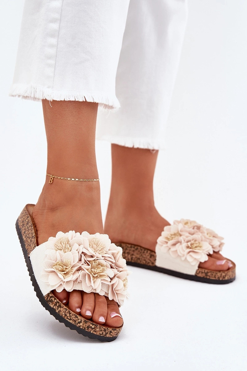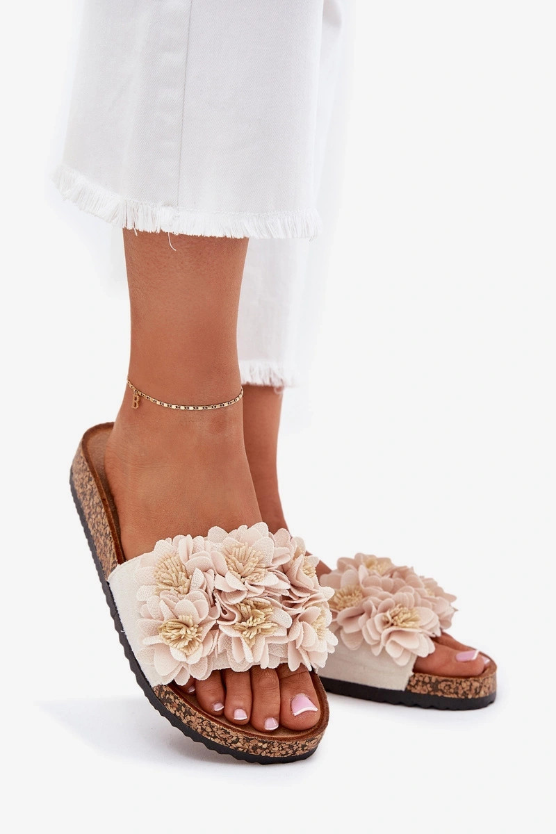 Dámske smilšu farby šľapky na korkovej podrážke s dekoratívnymi kvetinovými motívmi Seleneza