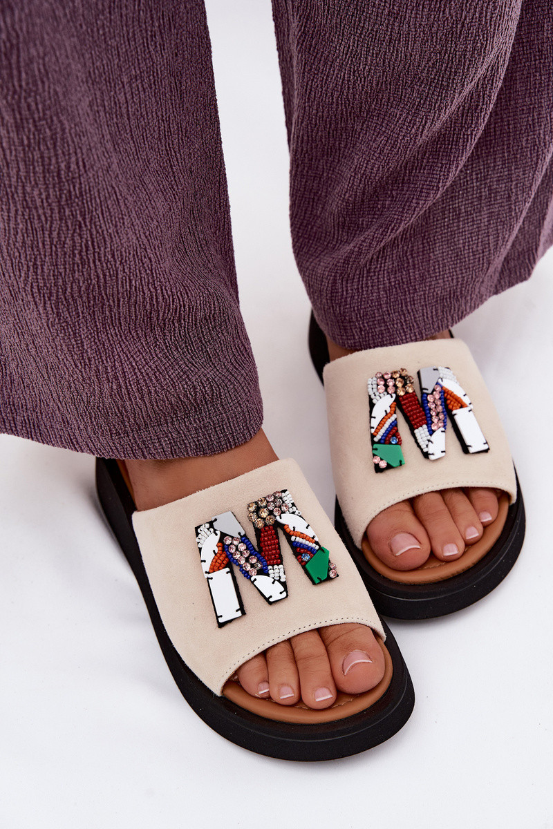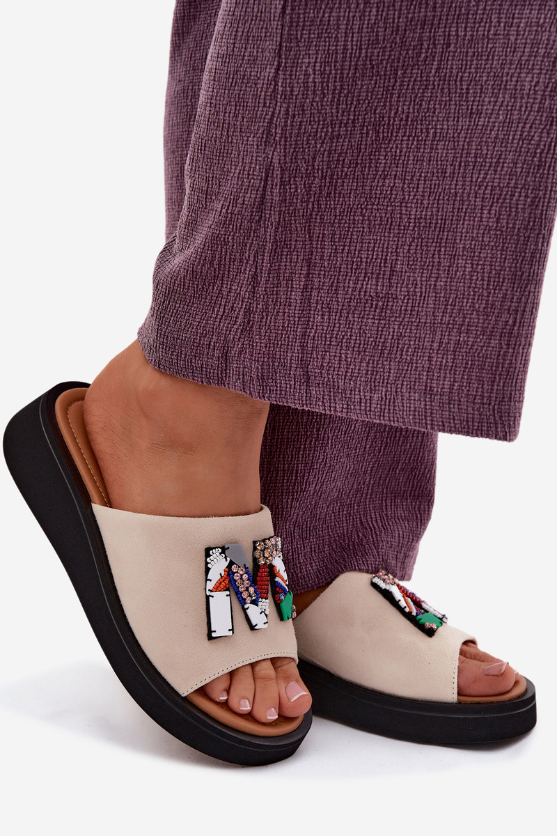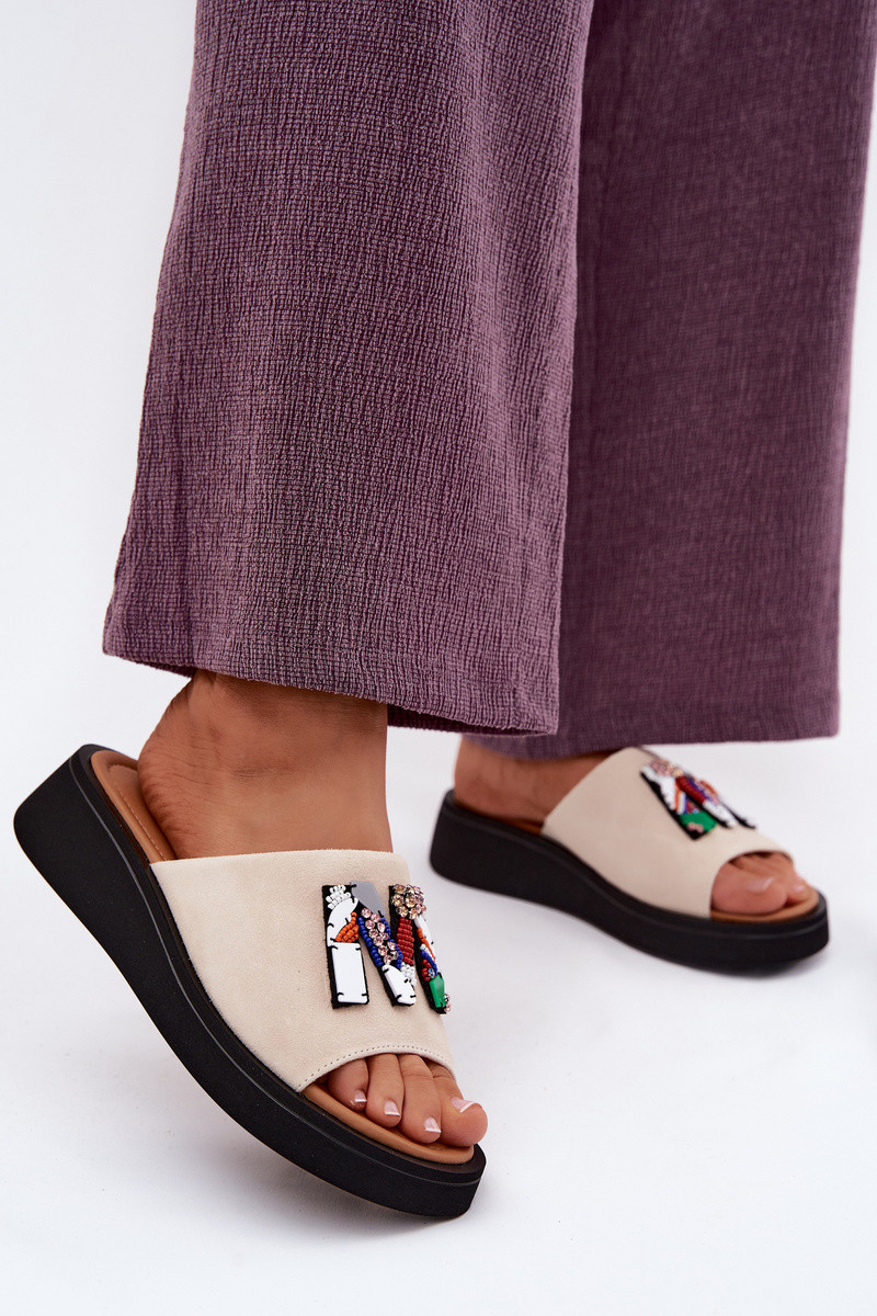 Kožené Dámske semišové papuče s ozdobami s platformou Vinceza 66942 béžová