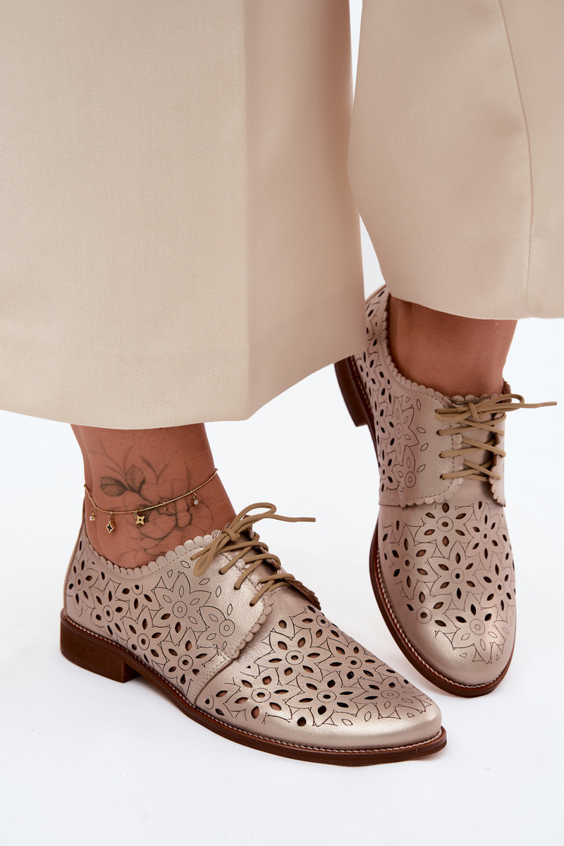 Kožené topánky s čipkovými prvkami a širokými podpätkami v zlatej