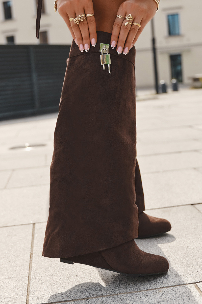 Módne dlhé čižmy na platforme s remienkami a striebornými detailmi čokoládovej farby Korivelle