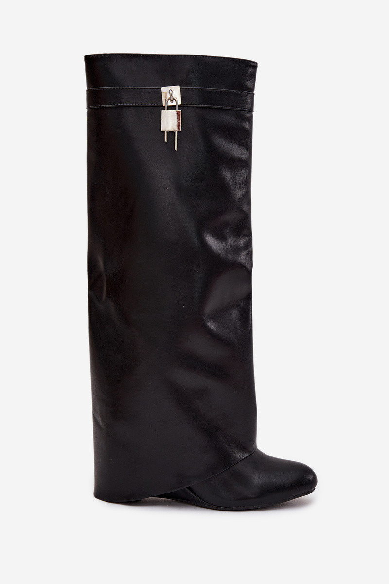 Módne dlhé čižmy na platforme s remienkami a striebornými detailmi z eko kože čiernej farby Korivelle