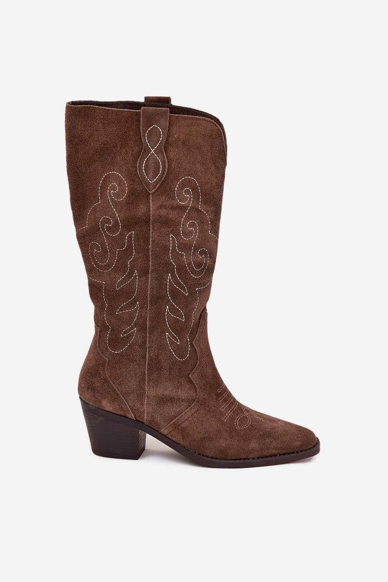 Módne dámske kožené čižmy v cowboy štýle, hnedé, Karira