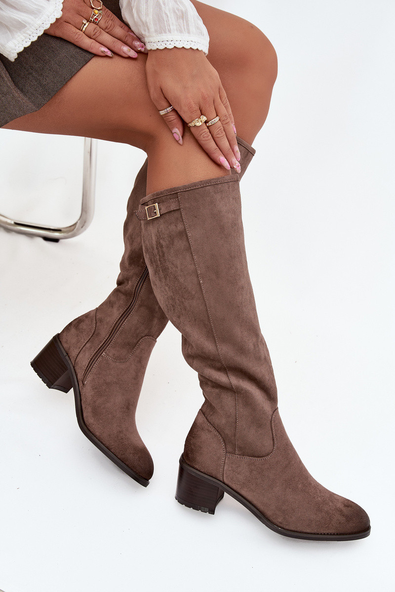 Teplé dámske vysoké čižmy s opätkami a zlatými sponami Vinceza 58589 pieskové