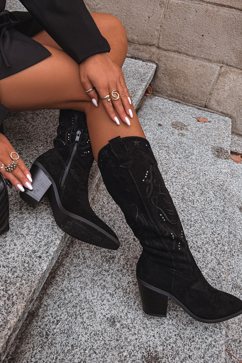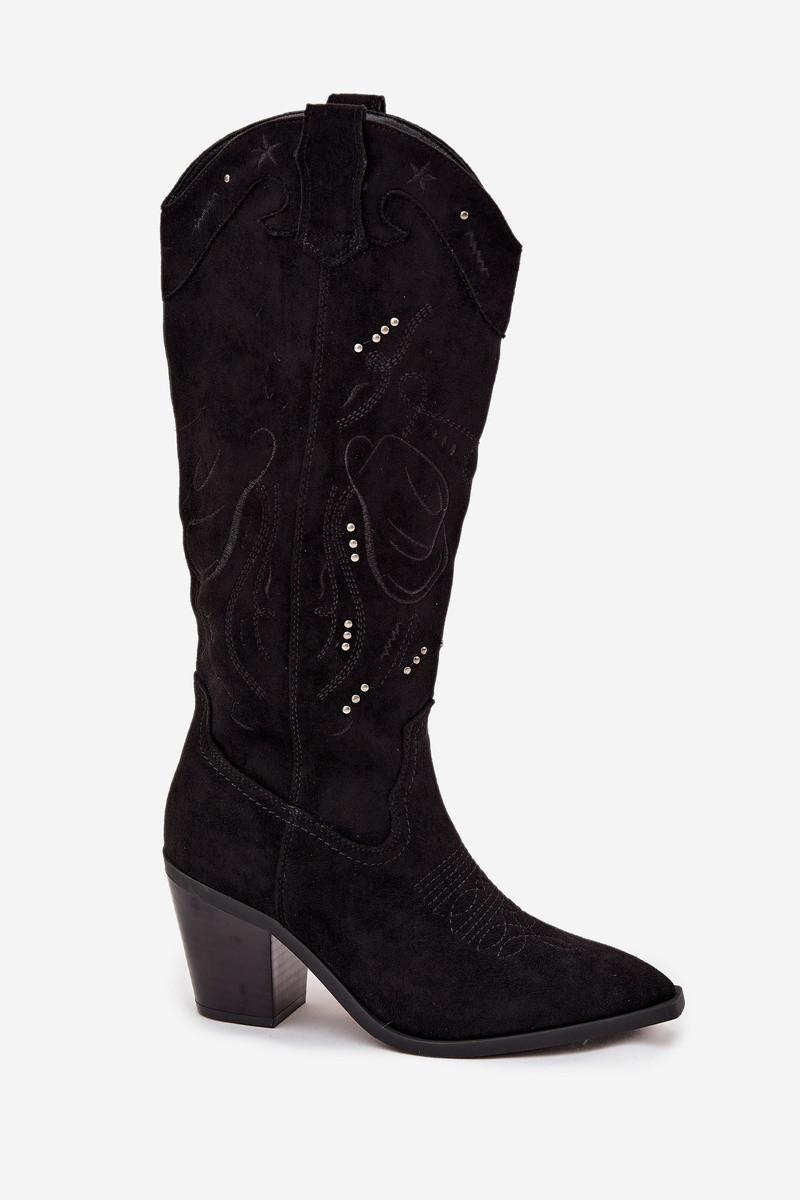 Dámske dlhé čižmy v cowboyskom štýle s podpätkami z umelej kože čiernej farby Coretta