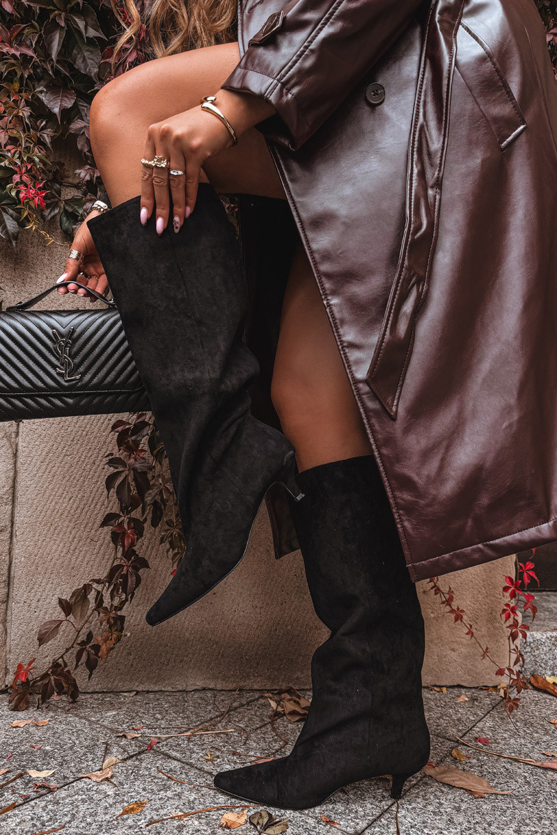 Dámske vysoké čižmy s podpätkami z umelé semišovej látky, čiernej farby Pheona