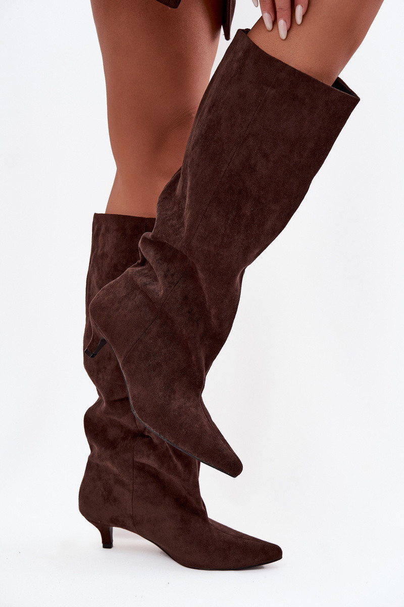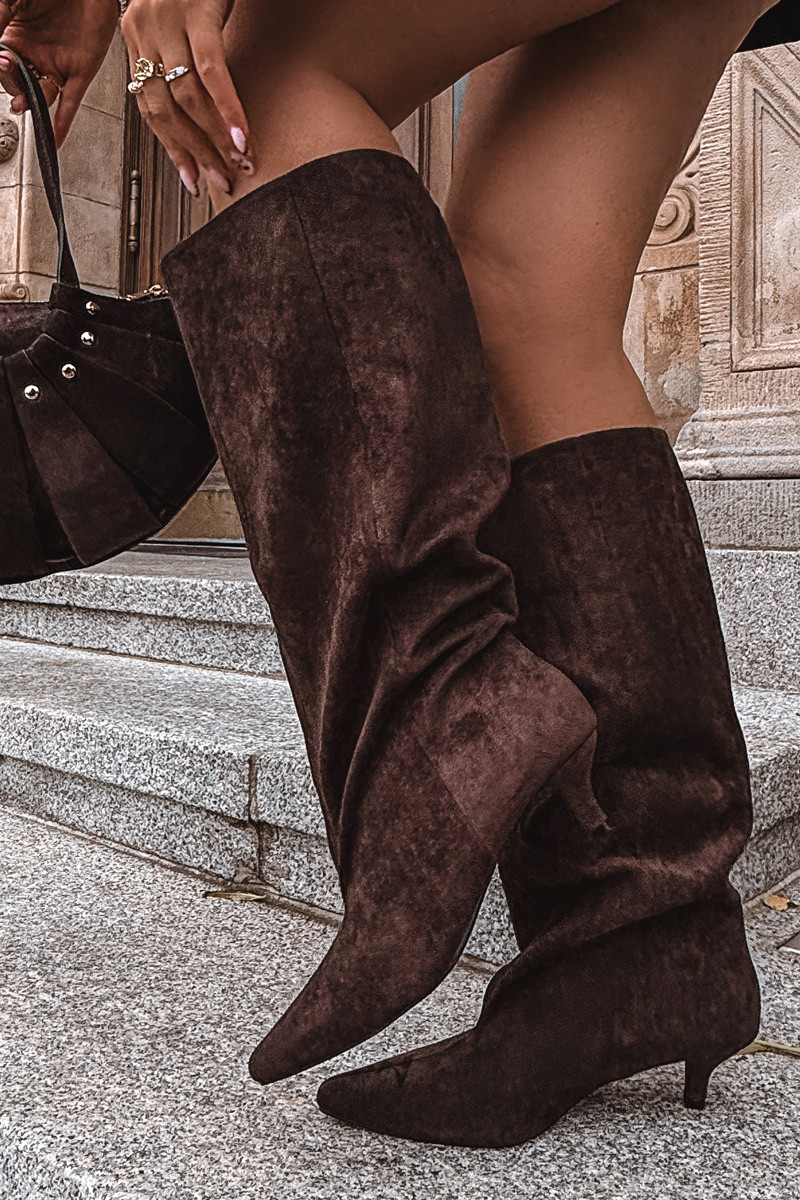 Dámske vysoké čižmy s podpätkami z umelé semišovej látky, čokoládovej farby Pheona