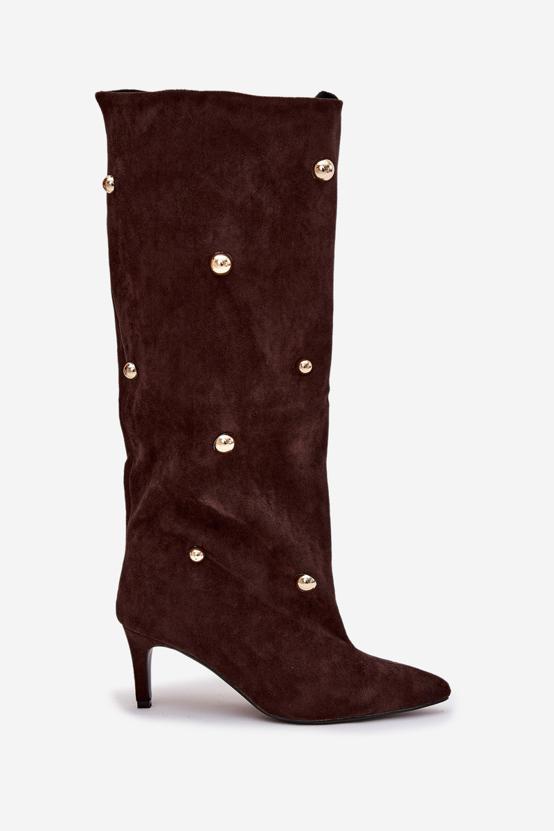 Hnedé dámske dlhé čižmy na zapínanie s tenkými podpätkami a zlatými dekoráciami Thaliane