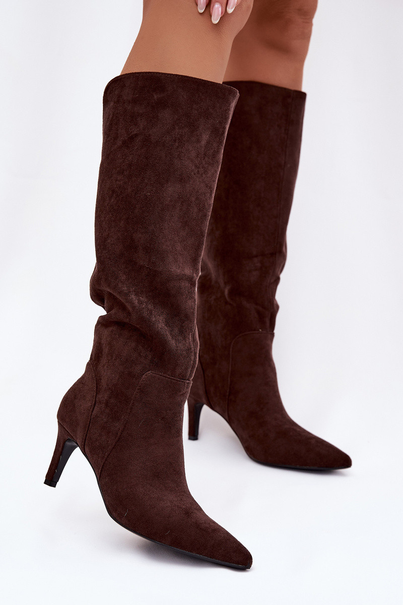 Čokoládové zateplené dámske vysoké čižmy s tenkými podpätkami z umelého semišu Arelisse
