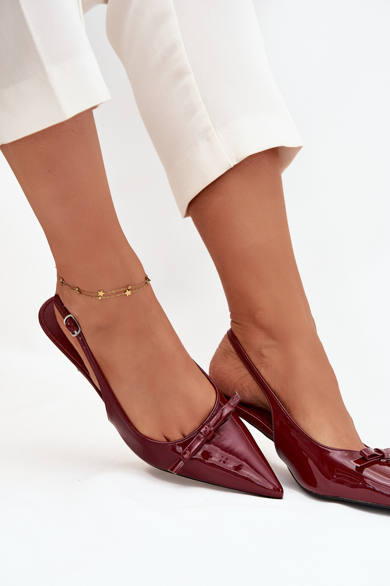 Lakovane topánky s tenkými podpätkami a mašľami bordovej farby Olvena