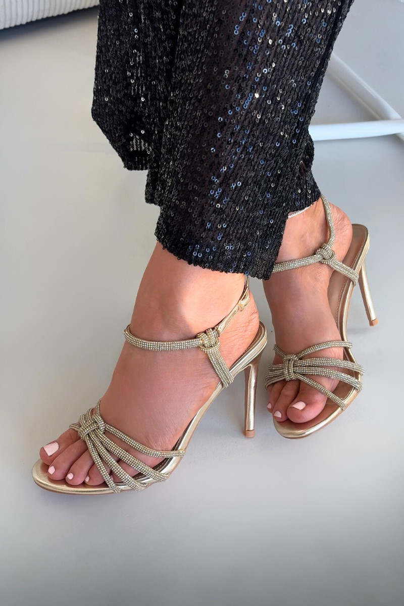 Dámske sandále s tenkými podpätkami S pruhmi A zirkóny zlatej farby Tanelle