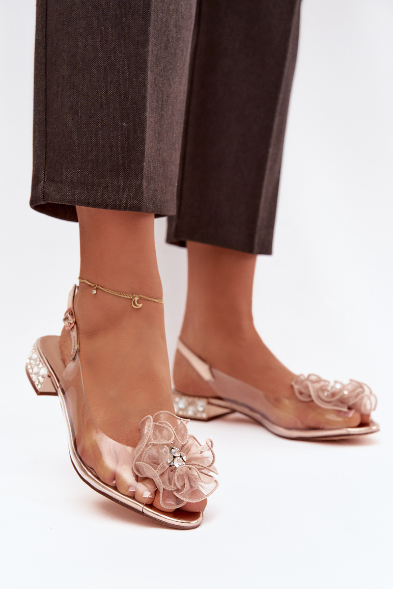 Ružovo-zlaté priesvitné sandále D&A MR52-230 na nízkom podpätku so žiariacimi kamienkami a dekoráciou