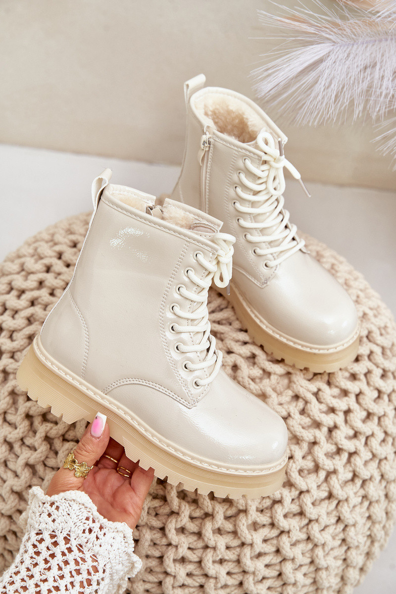 Zateplené detské topánky s lakovým efektom pieskovej farby Novita
